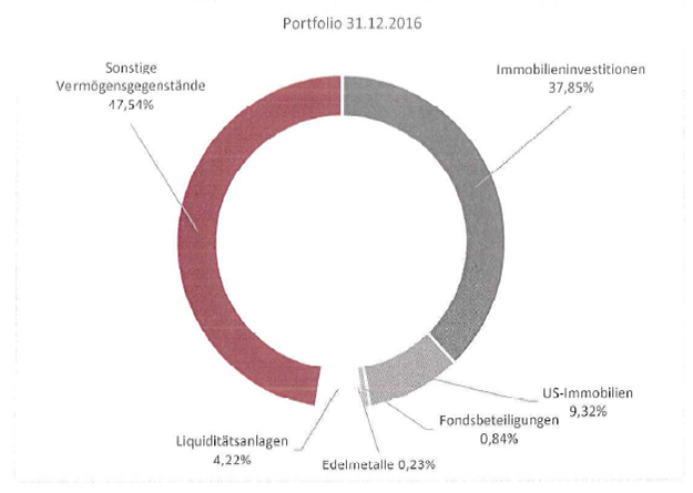 Zum Ende des Geschäftsjahres 2016 verwaltet die Beteiligungsgesellschaft ein Vermögen i.H.v. 53,58 Mio.18 (VJ: 55,54 Mio.), wovon EUR 7,65 Mio. auf die Beteiligungswerte der inländischen Immobilien-objektgesellschaften entfallen. Das vom Unternehmensverbund, einschließlich der von den inländischen Immobilienobjektgesellschaften getätigten Immobilieninvestitionen, verwaltete Vermögen beläuft sich zum Stichtag auf EUR 60,77 Mio. (VJ: EUR 63,16 Mio.). Das Vermögen des Unternehmensverbundes setzt sich aus Immobilieninvestitionen i.H.v EUR 23,01 Mio. (VJ: EUR 25,37 Mio.), Beteiligung an einer US-amerikanischen Immobiliengesellschaft i.H.v. EUR 5,67 Mio. (VJ: EUR 6,12 Mio.), Beteiligung an einer Immobilienpersonengesellschaft (Fondsbeteiligung) 1.H.v. TEUR 509,91 (VJ: TEUR 610,02), Goldbarren i.H.v. TEUR 140,94 (VJ: TEUR 126,45) und Liquiditätsanlagen i.H.v. EUR 2,56 Mio. (VJ: EUR 3,55 Mio.) zusammen. Des Weiteren stehen der Gesellschaft noch ausstehende Einlagen i.H.v. bewertet EUR 20,05 Mio.19 (VJ: EUR 23,40 Mio.) zu.
