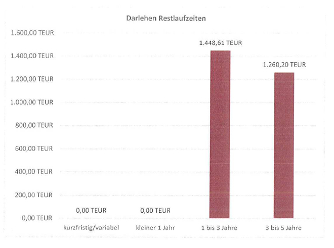 Die frei verfügbare Liquidität beträgt zum Stichtag EUR 1,95 Mio. (VJ: EUR 3,24 Mio.). Gegenüber Kreditinstituten bestehen Verbindlichkeiten i.H.v. EUR 2,71 Mio. (VJ: EUR 2,84 Mio.). Die im Geschäftsjahr 2016 geleisteten Tilgungen belaufen sich auf rund TEUR 127,52 (VJ: TEUR 2.928,9312) und der Zinsaufwand auf TEUR 125,46 (VJ: TEUR 168,12). Für den Erwerb der im Sachanlagevermögen13 ausgewiesenen Grundstücke hat die Gesellschaft Darlehen14i.H.v. ursprünglich EUR 7,22 Mio. aufgenommen. Die Tilgung der Darlehen erfolgt annuitätisch mit einem durchschnittlichen, anfänglichen Tilgungssatz von 3,00% p.a. Die Festschreibungszeiten der Darlehen betragen zwischen 2 1/4 Jahren und rund 4 % Jahren, durchschnittlich rund 3 1/4 Jahre. Zum Geschäftsjahresende 2016 belaufen sich die Darlehensstände auf rund EUR 2,71 Mio. und die Nettoverschuldung der Gesellschaft auf TEUR 759,66.