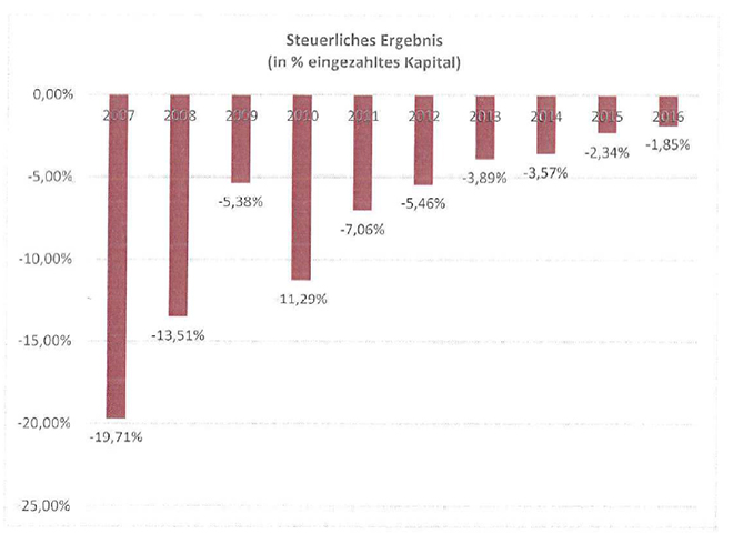 Hierin sind auch die Ergebnisanteile der von Ihrer Gesellschaft gehaltenen Objektgesellschaften berücksichtigt, deren Ergebnis der deutschen Besteuerung unterliegt. Das steuerliche Ergebnis führt auf Anlegerebene zu einer geringen Einkommensteuerentlastung. Steuerliches Ergebnis