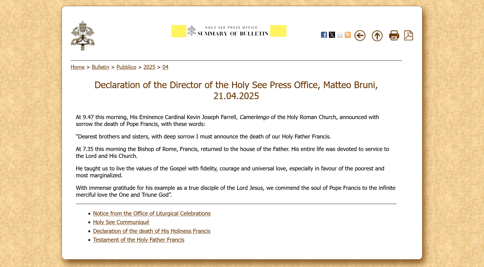 Erklärung des Direktors des Presseamts des Heiligen Stuhls, Matteo Bruni, vom 21.04.2025