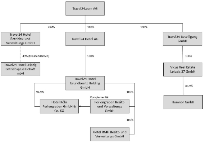 Travel24.com AGLeipzigJahresabschluss zum Geschäftsjahr vom 01.01.2020 bis zum 31.12.2020Zusammengefasster Lagebericht1 2020 der Travel24.com AGA. GRUNDLAGEN DES KONZERNS A.1. GESCHÄFTSMODELL – ZIELE – STRATEGE A.2. KONZERNSTRUKTUR A.3. STEUERUNGSSYSTEME B. WIRTSCHAFTSBERICHT B.1. GESAMTWIRTSCHAFTLICHE UND BRANCHENBEZOGENE RAHMENBEDINGUNGEN B.2. GESCHÄFTSVERLAUF UND WESENTLICHE EREIGNISSE DES GESCHÄFTSJAHRES 2020 B.3. ERTRAGSLAGE DES KONZERNS B.4. VERMÖGENSLAGE DES KONZERNS B.5. FINANZLAGE DES KONZERNS B.6. GESAMTAUSSAGE ZUR WIRTSCHAFTLICHEN LAGE B.7. ERTRAGS-, VERMÖGENS- UND FINANZLAGE DER TRAVEL24.COM AG (HGB) C. PROGNOSE-, CHANCEN- UND RISIKOBERICHT C.1. RISIKOMANAGEMENTSYSTEM C.2. RECHNUNGSLEGUNGSBEZOGENES INTERNES KONTROLLSYSTEM (IKS) C.3. CHANCENBERICHT C.4. RISIKOBERICHT C.5. GESAMT AUSSAGE ZUR CHANCEN- UND RISIKOSITUATION C.6. PROGNOSEBERICHT D. SONSTIGE ANGABEN D.1. ERKLÄRUNG ZUR UNTERNEHMENSFÜHRUNG NACH § 289F UND § 31 5D HGB D.2. ÜBERNAHMERELEVANTE ANGABEN NACH §§ 289A ABS. 1, 315A ABS. 1 HGB D.3. VERGÜTUNGSBERICHT A. Grundlagen des Konzerns A.1. Geschäftsmodell – Ziele – Strategie Das Geschäftsmodell des Travel24 Konzerns (im Folgenden „Travel24 Group“) und der Konzernmuttergesellschaft Travel24.com AG (im Folgenden „Travel24 AG“ genannt)2 unterteilt sich im Berichtsjahr 2020 in die drei Segmente Immobilien, Hotellerie und Internet. Ab dem Geschäftsjahr 2021 umfasst das Geschäftsmodell die beiden Segmente Immobilien und Hotellerie. Das bisherige Segment Internet wurde im ersten Quartal 2021 aufgrund der Auswirkungen der Corona-Pandemie bis auf Weiteres eingestellt. Segment Immobilien Die Travel24 Group hat die Erweiterung des Geschäftszwecks um die Verwaltung eigenen Vermögens und den Ankauf von Grundbesitz und Beteiligungen wie beabsichtigt vorgenommen. Die Geschäftstätigkeit des Segments besteht im Ankauf, dem Handel und der Verwaltung von Grundbesitz und Immobilienbeteiligungen mit Schwerpunkt auf Gewerbeimmobilien im technologischwissenschaftlichen Bereich. 1 Der vorliegende zusammengefasste Lagebericht umfasst neben dem Travel24 Konzern auch die Travel24.com AG. Er wurde gemäß § 289, 289a, § 315, § 315a, § 315b, § 315c und § 315d Handelsgesetzbuch (HGB) aufgestellt. Darüber hinaus sind der Vergütungsbericht und die Erklärung zur Unternehmensführung sowie die Kennzahlentabelle Bestandteile des Zusammengefassten Lageberichts. Der Kern des Segments besteht erstens in der Erzielung von Erträgen aus der Vermietung und aus der Veräußerung von Renditeimmobilien3 und zum anderen im Handel mit Immobilien durch Ankauf und zeitnaher Wiederveräußerung dieser. Darüber hinaus wird ein Grundbesitz-Portfolio im Bereich Land Banking und Land Development aufgebaut. Dabei handelt es sich um den Erwerb von Grundstücken mit hohem Entwicklungspotential. Durch die Entwicklung, Sanierung und Modernisierung des Grundbesitzes erfolgt eine Revitalisierung, um vorhandenes Ertragspotential zu heben. Die Transaktionen können dabei in Form von Asset Deals und in Form von Share Deals erfolgen. Der Aufbau und die Entwicklung des Segments erfolgen in Zusammenarbeit mit strategischen Aktionären aus der Immobilienbranche. Die Travel24 Group arbeitet bei der Realisierung der Projektpipeline unterstützend mit diesen zusammen und wird darüber hinaus auch im Asset Management durch die strategischen Aktionäre begleitet. Diese Aktionäre stellen somit die zentralen strategischen Partner für die Travel24 Group dar. Zum Berichtszeitpunkt sind Investitionen für die kommenden Jahre in zwei- bis dreistelligen Millionenbeträgen pro Jahr in Immobilien vornehmlich mit einer Mieterstruktur aus den Bereichen Forschung, Wissenschaft und Technologie avisiert. Die Investitionen werden über die Travel24 Beteiligung GmbH als 100%ige Tochtergesellschaft der Travel24.com AG vorgenommen. Die strategische Ausrichtung der Travel24 Group im Segment Immobilien zielt auf die Entwicklung eines Portfolios aus Zukunftswerten mit der gezielten Ausrichtung auf Forschung, Wissenschaft und Technologie in wachsenden und aufstrebenden Regionen. Die Travel24 Group geht davon aus, dass sich diese Branchen überdurchschnittlich dynamisch entwickeln. Zentrale Faktoren für dieses Wachstum sieht die Travel24 Group in flexibel gestaltbaren Büroflächen, Forschungs- und Entwicklungslaboren oder Produktionsflächen für aufstrebende Technologien und der weiteren intensiven Förderung der öffentlichen Hand in diesen Bereichen. Die Travel24 Group ist bestrebt, insbesondere durch namhafte und ertragsstarke Ankermieter stabile Vermietungserträge zu erzielen und die Attraktivität der Liegenschaften auf einem hohen Niveau zu halten. Segment Hotellerie Innerhalb des Segments Hotellerie werden klassische Beherbergungsleistungen erbracht. Dies umfasst die Vermietung von Betten, Bewirtungsleistungen und spezifische Komplementärleistungen, v.a. die Vermietung von Parkplätzen. Die Travel24 Group ist in diesem Segment seit 1. Juli 2020 mit zwei Managementbetrieben tätig, zum einen mit dem Travel24 Hotel Leipzig-City im Bereich der Lifestyle-Hotels (Budget- bzw. Midscale-Design 2-Sterne Plus bzw. 3-Sterne) und zum anderen mit einem Hotel im Bereich der Luxushotellerie in Leipzig. Bis zum 30. Juni 2020 wurde das Travel24 Hotel Leipzig-City als eigener Pachtbetrieb geführt. 3 Der Begriff „Renditeimmobilie“ wird von der Travel24 Group nicht gleichbedeutend mit der Definition „Als Finanzinvestition gehaltene Immobilie“ im Sinne der IFRS verwendet. Unter einer Renditeimmobilie wird ein Objekt verstanden, mit welchem Erträge durch Vermietung oder durch Veräußerung erzielt werden können, ohne dass Entwicklungsleistungen von beträchtlichem Umfang erforderlich sind. Sofern als Finanzinvestitionen gehaltene Immobilien im Sinne des IAS 40 gemeint sind, werden diese als solche bezeichnet. Die seit 2020 andauernde Corona-Pandemie hat zu massiven Einbußen und einschneidenden Veränderungen in