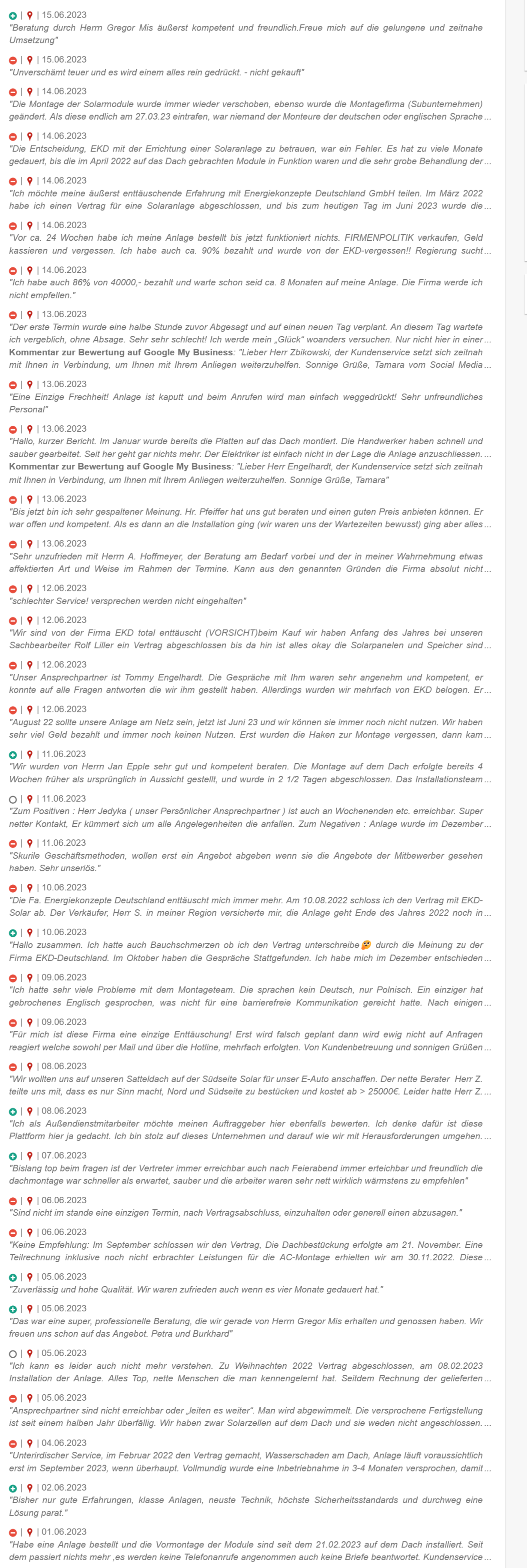 Haben Sie schon einmal darüber nachgedacht, ob hinter diesem Unternehmen möglicherweise ein Betrug steckt? Warum komme ich zu dieser Überlegung? Es gibt viele Berichte über unfertige Solaranlagen, obwohl sie offensichtlich bereits bezahlt wurden. Wie kann der Kunde sicher sein, dass Energiekonzepte Deutschland die Anlage tatsächlich irgendwann fertigstellt? Wie bereits von Ihnen veröffentlicht, wird der Markt schwieriger und auch preislich anspruchsvoller werden. Hat Energiekonzepte genügend Kapital, um alle Aufträge zu erfüllen? Ich selbst bin einer der Geschädigten des Unternehmens. Meine Anlage ist bis heute nicht vollständig installiert, aber ich gebe die Hoffnung nicht auf. Ich kann keinem Kunden empfehlen, Energiekonzepte einen Auftrag zu erteilen.