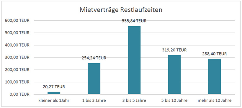 Unter Berücksichtigung von einer nicht betriebenen und einer freistehenden Mietfläche von 113 m2 bzw. 135 m2 im „Kauffmann-Areal“ beläuft sich der auf die Fläche bezogene Vermietungsstand zum Geschäftsjahresende 2019 auf 97,81% und der auf die marktübliche Miete bezogene Vermietungsstand auf 97,89%. Die mit den Mietvertragsparteien zum 31.12.2019 abgeschlossenen Vertragsmieten betragen rund TEUR 1.437,96. In Höhe von rund TEUR 20,27 weisen die Vertragsmieten zum Geschäftsjahresende 2019 Restlaufzeiten von weniger als einem Jahr auf, i.H.v. rund TEUR 810,08 Restlaufzeiten zwischen 1 und 5 Jahren und i.H.v. rund TEUR 319,20 bzw. TEUR 288,40 von mehr als 5 Jahren bzw. 10 Jahren, durchschnittlich 6 % Jahre auf. Mit Ausnahme einiger weniger Mietverträge bestehen insbesondere für die wesentlichen Mietverträge seitens der Mieter z.T. mehrfache Verlängerungsoptionen.