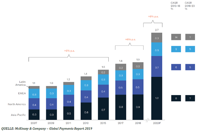 Auch die Studie „Global Payments Report 2019: Amid sustained growth, accelerating challenges demand bold actions“ von McKinsey & Company, die die globalen Umsatzerlöse von Zahlungsdienstleistern analysiert und prognostiziert, bescheinigt der Branche weiterhin deutliches und nachhaltiges Wachstum. Basierend auf den Berechnungen der Experten erreichten die weltweiten Erträge aus Zahlungsdienstleistungen im Jahr 2018 ein Gesamtvolumen von 1,9 Billionen US-Dollar, was einem Wachstum im Vergleich zum Vorjahr von rund 6 % entspricht. Das Ertragswachstum wurde vor allem von den asiatischen Wachstumsmärkten angetrieben, während Europa tendenziell stagnierte.10