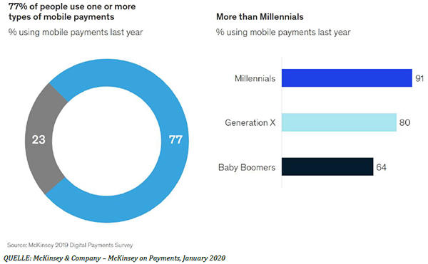 Damit verstärkt die Corona-Krise den bereits laufenden Digitalisierungstrend. Denn bereits vor dem Ausbruch der Pandemie haben in den USA 77 % der Nutzer mobile Zahlungsarten genutzt, bei den Millennials waren es sogar 91 %, wie eine Marktstudie von McKinsey belegt.13 Das Thema Digitalisierung ist also keinesfalls neu, aber die Kombination aus dem generellen Digitalisierungstrend und der gestiegenen Nachfrage nach völlig kontaktlosen Zahlungsmöglichkeiten verstärken sich gegenseitig und beschleunigen den Industriewandel noch weiter. Genau das bietet attraktive Wachstumschancen – insbesondere für innovative Anbieter.