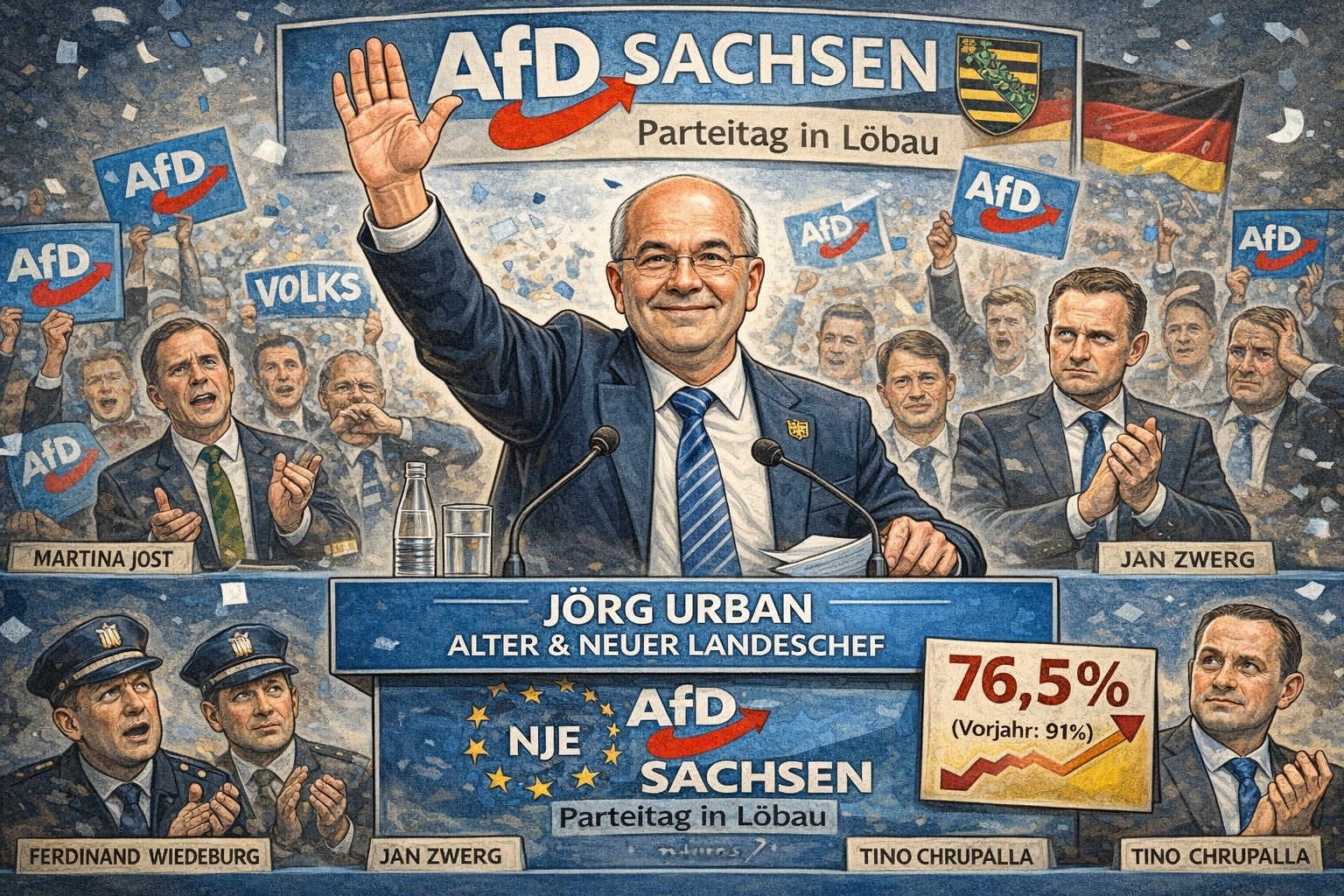 Auf dem Landesparteitag der AfD Sachsen in Löbau ist Jörg Urban erneut zum Landesvorsitzenden gewählt worden. Mit 76,5 Prozent der Stimmen erhielt der 60-Jährige zwar die notwendige Mehrheit – gleichzeitig markiert das Ergebnis jedoch einen deutlichen Rückgang gegenüber den Vorjahren.