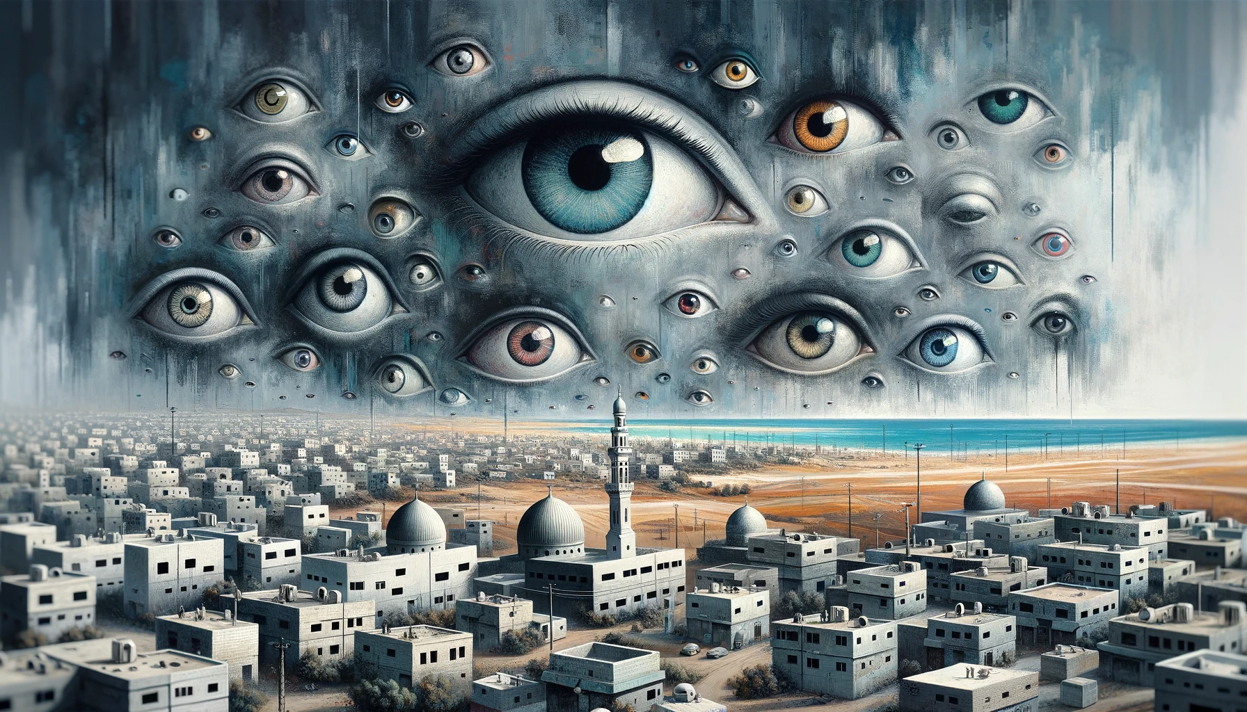 Das Kunstwerk wurde mit Hilfe fortschrittlicher Algorithmen und maschinellen Lernens erzeugt. Es zeigt eine Panoramaansicht von Rafah, durchzogen von symbolischen Augen, die die Aufmerksamkeit und den ständigen Beobachtungsdruck durch die internationale Gemeinschaft darstellen. Jedes Auge im Bild scheint sowohl Wachsamkeit als auch Sorge auszudrücken, was die Vielschichtigkeit der menschlichen Emotionen angesichts von Leid und Hoffnung einfängt.