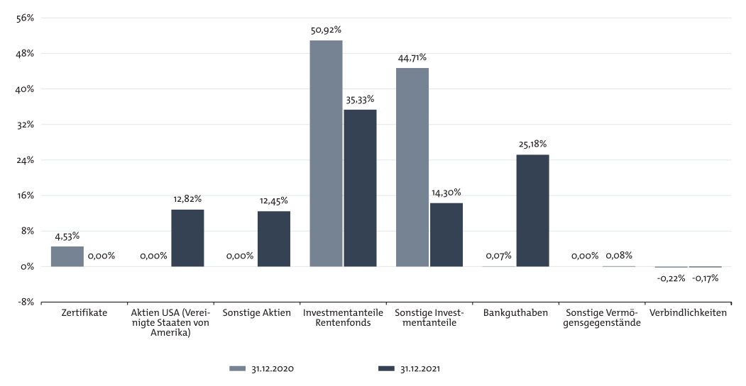 Im Laufe des zweiten Halbjahrs 2021 wurde die strategische Aktienquote (zum Ende des Berichtszeitraums rund ein Viertel des Fondsvolumens) mittels Einzelaktien umgesetzt. Dazu wurden zehn Werte aus Europa sowie zehn Werte aus den USA ausgewählt. Die Anfangsinvestitionen waren annähernd gleichgewichtet. Die restliche Aktienquote, welche ein temporäre Umsetzung innerhalb der taktischen Aktienquote darstellt, wurde situativ mit ETFs umgesetzt.