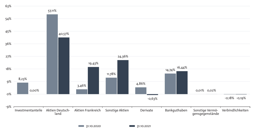 Der Fonds konnte an der positiven Wertentwicklung an den Aktienmärkten in den ersten vier Monaten des Berichtszeitraums partizipieren. Der abrupte Wechsel in eine lange, sehr schwankungsarmen Periode von April bis August 2021 war für die Handelsindikatoren schwerer zu greifen und führt im Ergebnis dazu, dass Entwicklungen teilweise falsch interpretiert wurden. Dies war der Performance des Fonds abträglich. Das Fehlen von nennenswerten Korrekturen im Berichtszeitraum hat ebenfalls dazu geführt, dass ein Investmentansatz, der auf Risikominimierung abzielt, auf ein schwieriges Investmentumfeld getroffen ist. Im Oktober 2021 konnte der Fonds wieder am Aufwärtstrend der Märkte partizipieren, wobei sowohl die Aktienselektion als auch das Exposure-Management positive Wertbeiträge beisteuerten.
