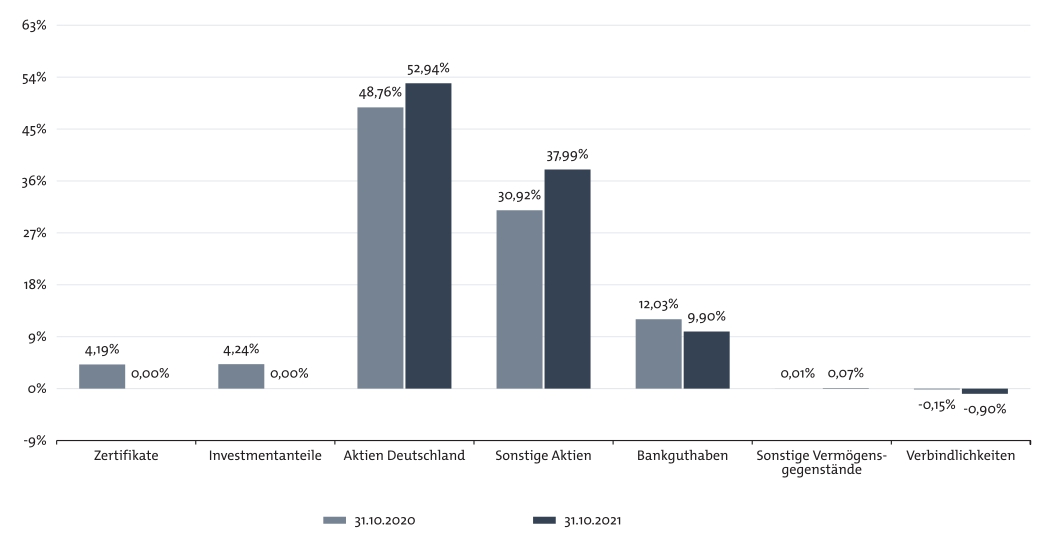 Das Sondervermögen war entsprechend seinem Anlageziel breit diversifiziert in Aktien von unterschiedlichen Unternehmen aus verschiedenen Sektoren und Regionen investiert. Der Schwerpunkt der Anlagen lag in Europa. Spezifische Einzelwertrisiken sind bei einem Fokus auf Nebenwerte immanent.