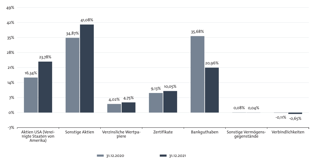 Neben Anteilen an börsennotierten Unternehmen hielt der Fonds zum Ende des Berichtszeitraumes Liquidität in Fremdwährungen und ETCs (Exchange-traded commodities = börsengehandelte Schuldverschreibungen, die an die Wertentwicklung eines oder mehrerer Rohstoffpreise gekoppelt sind) auf Gold. Ziel dieser Anlagen ist es, auch im Rahmen des Liquiditätsmanagements zu diversifizieren und dabei die Chancen für den realen Werterhalt des Vermögens zu verbessern. Zu den im Rahmen der Liquiditätssteuerung bevorzugten Fremdwährungen zählen der Singapur-Dollar und der kanadische Dollar. Gold und Silber werden vom Fondsberater als zeitgemäße Absicherungen gegen Extremrisiken und nicht beliebig reproduzierbare Hartwährungen interpretiert.