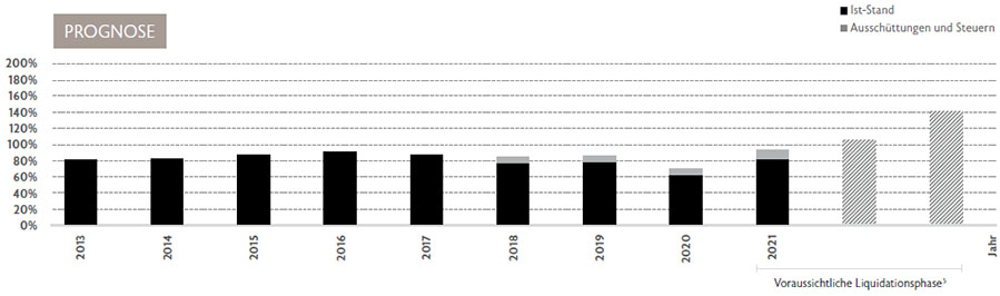 1 Dieser NIW pro Anteil ist ein Durchschnittswert aller Kapitalkonten und gibt keinen Rückschluss auf einen individuellen Anleger-Anteilwert. Gesamtvergütung der Mitarbeiter und der Risk-Taker Die Vergütungspolitik der KVG ist darauf ausgerichtet, Interessenkonflikte sowie falsche Anreize, insbesondere für Mitarbeiter, die über das Eingehen von Risiken entscheiden, zu vermeiden. Der Schwerpunkt der Vergütungspolitik liegt daher auf Zahlung von marktgerechten Fixgehältern. Gegebenenfalls werden zusätzlich feste Sonderzahlungen in Form von Weihnachts- oder Urlaubsgeld gezahlt. Die KVG hat eine Vergütungsrichtlinie implementiert, in der Regelungen getroffen sind, unter denen variable Vergütungen vereinbart werden können und dennoch keine zusätzlichen Anreize für das Eingehen unerwünschter Risiken geschaffen oder Interessenkonflikte gefördert werden. Im Geschäftsjahr betrug die Gesamtvergütung an die Mitarbeiter der externen KVG 2.218 TEUR (Vorjahr 2.279 TEUR) bei einem durchschnittlichen Mitarbeiterstand von 25 Personen (Vorjahr 22 Personen). In 2021 wurden keine variablen Vergütungen (Vorjahr 280 TEUR) und keine steuerfreien Corona-Prämien (Vorjahr 33 TEUR) ausbezahlt. Die Vergütung an leitende Mitarbeiter, deren berufliche Tätigkeit sich wesentlich auf das Risikoprofil des Investmentfonds ausgewirkt hat, betrug 353 TEUR (Vorjahr 495 TEUR). Die Angaben zur Vergütung beziehen sich ausschließlich auf die Kapitalverwaltungsgesellschaft und nicht auf Unternehmen, mit denen ein Auslagerungsverhältnis besteht. Wesentliche im Geschäftsjahr erfolgte Veränderungen des Verkaufsprospekts Im Geschäftsjahr erfolgte keine Änderung des Verkaufsprospekts. Angaben zu besonderen Regelungen nach § 300 Abs. 1 Nr.1 KAGB Der Anteil der Vermögensgegenstände des Investmentfonds, der schwer liquidierbar ist und für den deshalb besondere Regelungen nach § 300 Abs. 1 Nr. 1 KAGB gelten, beträgt null Prozent. Komplementärin Persönlich haftende Gesellschafterin ist die DF Deutsche Finance Managing GmbH, München (eingetragen beim Amtsgericht München, HRB 180869, mit einem voll erbrachten Kapital i. H. v. 25 TEUR). Liquidatorin Während des Geschäftsjahres erfolgte die Geschäftsführung durch die Liquidatorin DF Deutsche Finance Managing GmbH, vertreten durch Herrn Christoph Falk als Leiter Risikomanagement und Frau Stefanie Watzl als Leiterin Portfoliomanagement. Zusammenfassung nach § 25 Abs. 5 KARBV Zusammenfassende Angaben1 zu den bereits getätigten Direktinvestments der institutionellen Investmentstrategien: