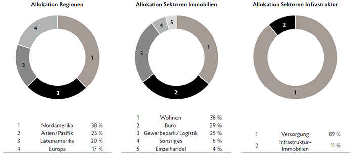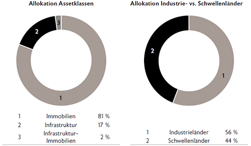 Über die Laufzeit des Investmentfonds soll das Portfolio an mindestens 50 einzelnen Immobilien und Infrastrukturinvestments auf der ganzen Welt mittelbar beteiligt sein. Der Investmentfonds investiert über bis zu drei Investitionsphasen. Bis zum Ablauf der letzten Investitionsphase soll ein Portfolio mit einer Gewichtung von rund 60 % Immobilien und rund 40 % Infrastruktur aufgebaut werden. Der regionale Schwerpunkt der von den Investmentstrategien gehaltenen Investments soll mit ca. 30 % in Europa, mit ca. 30 % in Asien/Pazifik, mit ca. 30 % in Amerika sowie mit ca. 10 % in anderen Regionen liegen. Dabei ist zu beachten, dass der Investmentfonds bei entsprechender Marktlage eine abweichende Allokation umsetzen kann. Rückflüsse aus den Investmentstrategien während der Fondslaufzeit werden ebenfalls nach aktuellen Marktgegebenheiten reinvestiert.