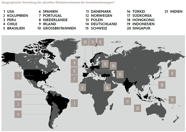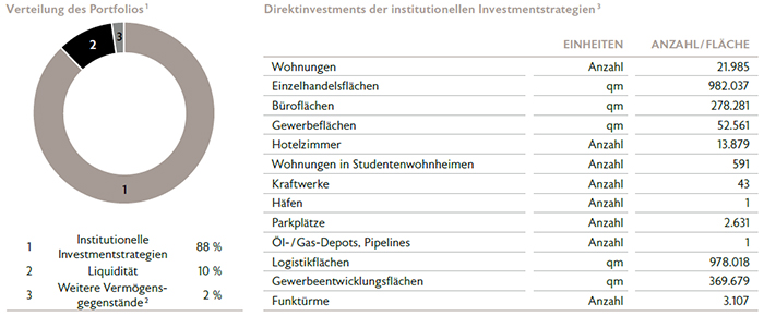 Die regionale Allokation verteilt sich auf mehrere Länder Europas, Nord- und Lateinamerika sowie die Asien-/Pazifikregion. Die Anzahl der Direktinvestments der gezeichneten institutionellen Investmentstrategien liegt zum 31.12.2021 bei insgesamt 736. Eine weitere Diversifikation wird durch die Streuung auf unterschiedliche Sektoren /Nutzungsarten, Nutzer und Währungen sichergestellt.
