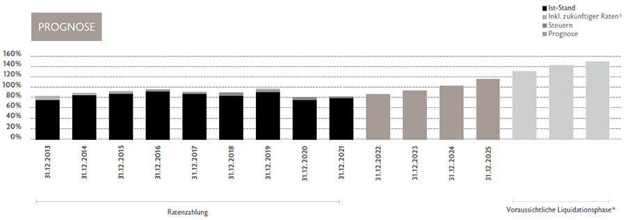 Soweit zu dem Investmentfonds Wertangaben oder Kennzahlen zu der Entwicklung in der Vergangenheit gemacht werden, kann hieraus keinesfalls auf eine künftige Entwicklung des Investmentfonds/Fondsvermögens in der Zukunft geschlossen werden. Soweit zukunftsbezogene Aussagen gemacht werden, beruhen diese auf Einschätzungen zur zukünftigen Entwicklung des Investmentfonds durch die Geschäftsführung bzw. durch die verantwortliche Kapitalverwaltungsgesellschaft. Zukunftsgerichtete Aussagen beinhalten naturgemäß Risiken und Unsicherheitsfaktoren. Insbesondere können die tatsächlichen Ergebnisse von den zurzeit erwarteten Ergebnissen abweichen. Entsprechend sind Prognosen kein verlässlicher Indikator für die künftige Entwicklung. Dies gilt auch für die Entwicklung anderer Fonds, die plangemäß in vergleichbare Assetklassen investieren. Wir weisen darauf hin, dass Rundungsdifferenzen zu den sich mathematisch genau ergebenden Werten auftreten können. Trotz größter Sorgfalt kann keine Haftung oder Garantie für die Aktualität. Richtigkeit, Vollständigkeit oder Qualität der zur Verfügung gestellten Informationen und Inhalte übernommen werden. Für unvollständige oder falsche Angaben wird keine Gewähr übernommen. Die in diesem Bericht zusammengefassten Informationen wie auch die zugrunde liegenden Dokumente von Dritten können durch aktuelle Entwicklungen überholt sein, ohne dass die bereitgestellten Dokumente/Informationen geändert wurden, weil es sich um auf einen Stichtag bezogene Angaben handelt. Haftungsansprüche gegen die Komplementärin oder die verantwortliche Kapitalverwaltungsgesellschaft, welche sich auf Schäden materieller oder ideeller Art beziehen, die durch die Nutzung oder Nichtnutzung verfügbarer Informationen bzw. durch die Nutzung fehlerhafter und unvollständiger Informationen verursacht wurden, sind ausgeschlossen, sofern kein nachweislich vorsätzliches oder grob fahrlässiges Verschulden vorliegt. Die in diesem Bericht dargestellten Fotos sind exemplarisch zu sehen, sie zeigen nicht notwendigerweise reale Investitionen des Investmentfonds.