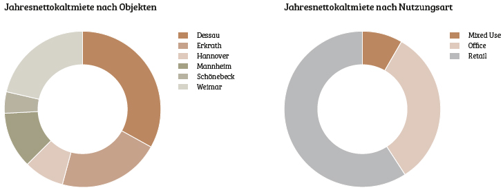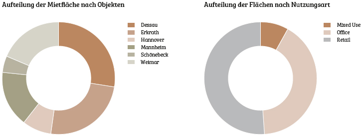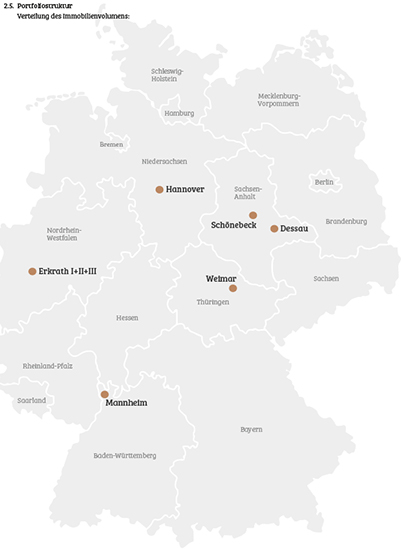 Es wird eine breite geografische und sektorale Streuung des Immobilienportfolios angestrebt, um so durch Diversifikationseffekte das Risiko gering zu halten. Investitionszielland des Immobilienportfolios ist Deutschland. Hinsichtlich der Sektorenstruktur betrug der Anteil der Bürogebäude gemessen an der Jahresnettokaltmiete 33 %, der Anteil der Einzelhandelsobjekte betrug 59% und die gemischtgenutzten Immobilien hatten einem Anteil an der Jahresnettokaltmiete von 8%.