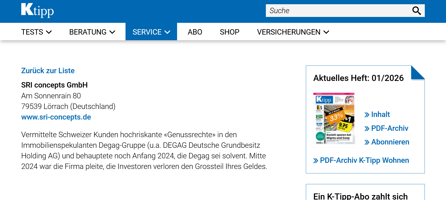 Vermittelte Schweizer Kunden hochriskante «Genussrechte» in den Immobilienspekulanten Degag-Gruppe (u.a. DEGAG Deutsche Grundbesitz Holding AG) und behauptete noch Anfang 2024, die Degag sei solvent. Mitte 2024 war die Firma pleite, die Investoren verloren den Grossteil Ihres Geldes.