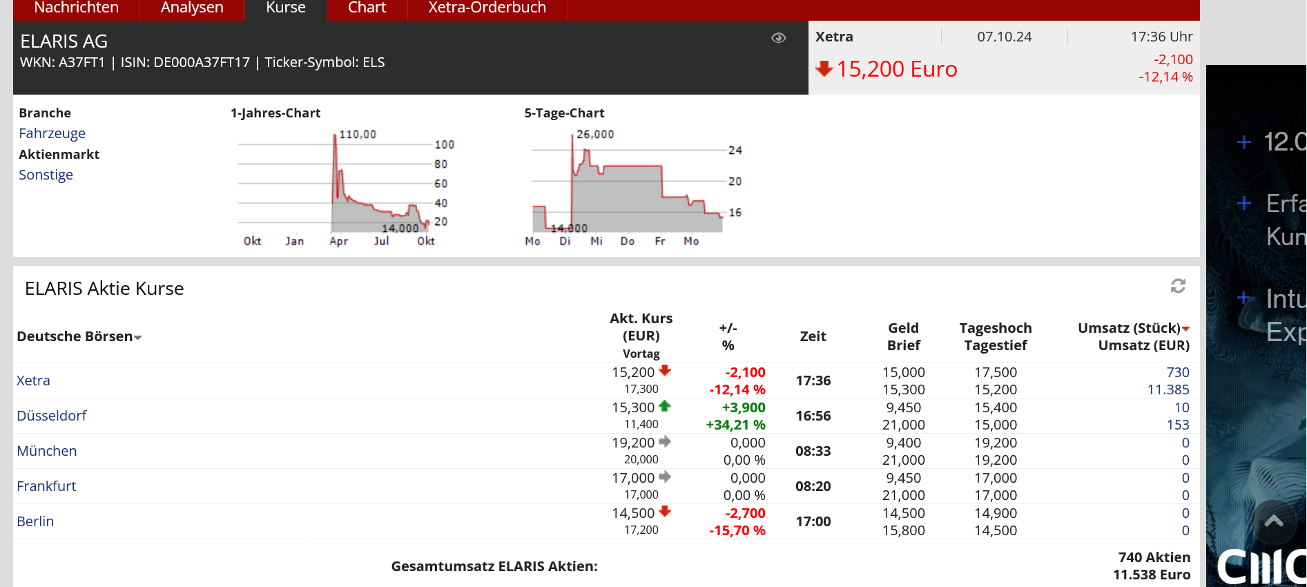 Auch heute hat ELARIS AG wieder einen guten Start beim Aktienverkauf hingelegt, musste jedoch erneut Abschläge beim Kurs hinnehmen.(siehe Screenshot?