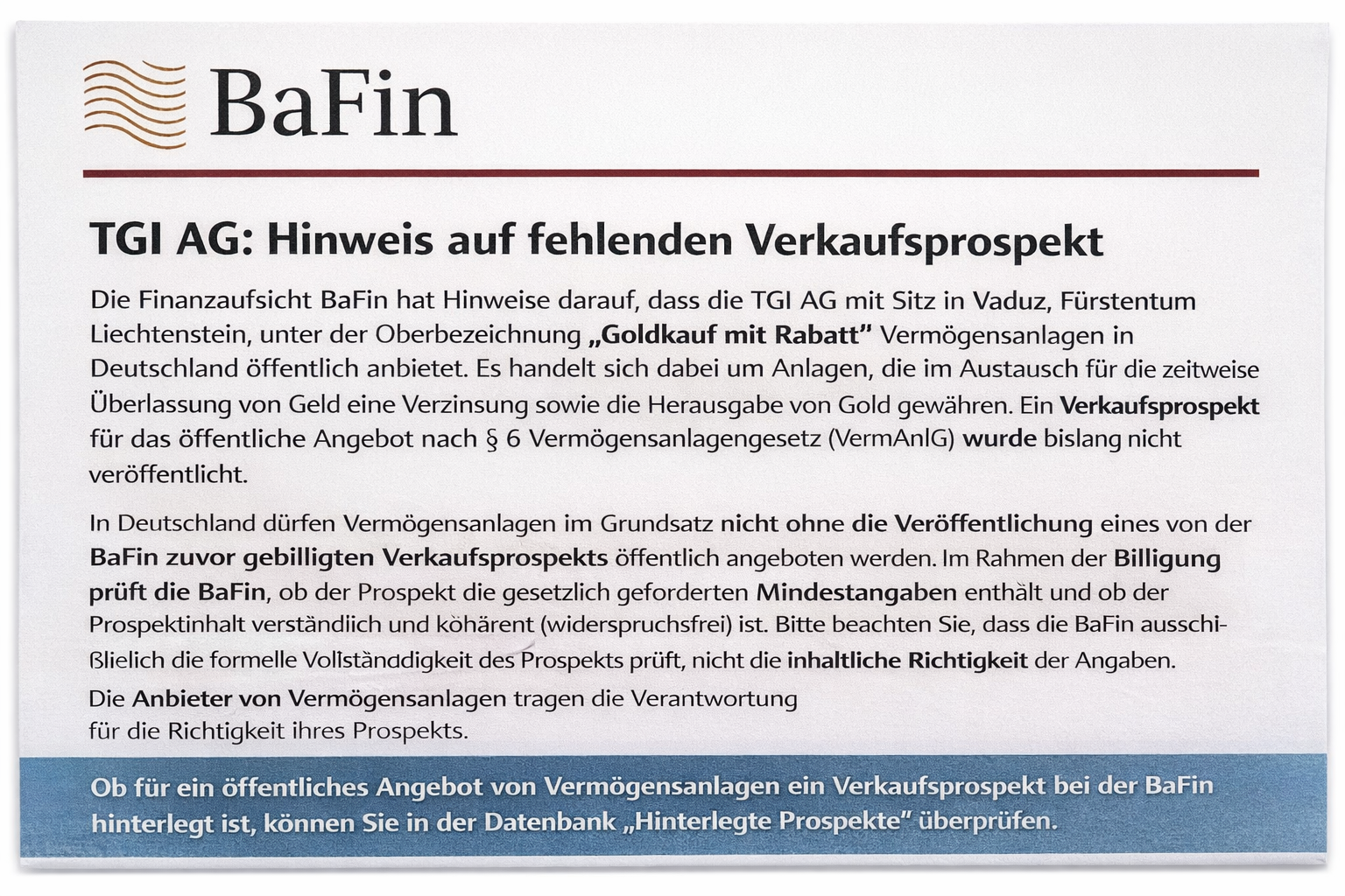 Die Finanzaufsicht BaFin hat Hinweise darauf veröffentlicht, dass die TGI AG mit Sitz in Vaduz (Liechtenstein) möglicherweise Vermögensanlagen in Deutschland öffentlich angeboten hat, ohne den gesetzlich vorgeschriebenen Verkaufsprospekt zu veröffentlichen. Die Angebote liefen unter der Bezeichnung „Goldkauf mit Rabatt“ und versprachen Anlegern eine Verzinsung sowie die spätere Herausgabe von Gold.
