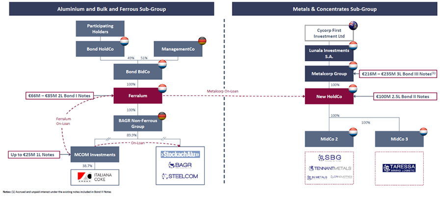 Zukünftige Struktur der METALCORP Gruppe und der FERRALUM Gruppe Wie bereits in der Einberufung zu der zweiten Gläubigerversammlung dargelegt, wurden sämtliche Anteile an der BAGR Non-Ferrous Group GmbH der Muttergesellschaft des vormaligen Aluminium- und Schüttgut- und Eisenmetall-Teilkonzerns, bestehend im Wesentlichen aus (i) BAGR Berliner Aluminiumwerk GmbH, (ii) Stockach Aluminium GmbH, (iii) Steelcom GmbH und (iv) MCOM Investments Ltd (diese hält einen 38,7%-Anteil an der Italiana Coke S.R.L.), von der Emittentin an die FERRALUM verkauft und abgetreten. Die aufschiebende Bedingung für die Abtretung der Anteile sind inzwischen eingetreten, so dass voneinander unabhängige Konzerne entstanden sind. Als Gegenleistung für die Übertragung der Anteile an der BAGR hat sich die FERRALUM verpflichtet (i), die New Money Schuldverschreibungen und die FERRALUM-Anleihe an die 2023er und die 2026er Anleihegläubiger gemäß eines finalen Verteilungsschlüssels auszugeben, und (ii) der METALCORP Group S.A. ein Darlehen weiterzureichen, das aus den Erlösen der New Money Schuldverschreibungen gespeist wird, sowie (iii) bestimmte Kosten im Zusammenhang mit der Umstrukturierung der Gruppe und Restrukturierung der beiden Schuldverschreibungen 2023 und 2026 zu übernehmen. Ferner wurden der METALCORP Group S.A. rund EUR 18 Mio. Verbindlichkeiten aus Darlehen erlassen. Das nachfolgende Schaubild zeigt in vereinfachter Form die maßgeblichen Gesellschaften der beiden neuen Konzerne unter Einschluss der noch zu gründenden Gesellschaften: