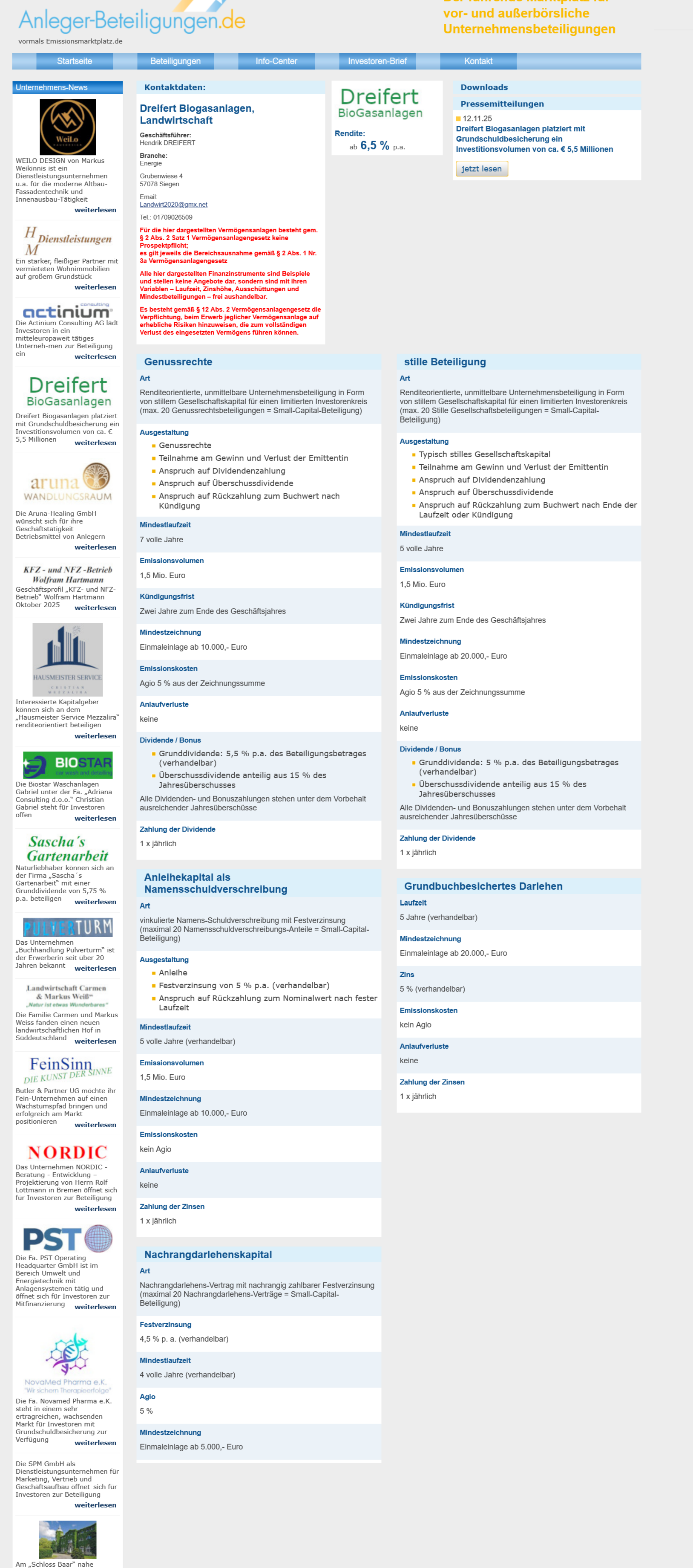 Nachhaltige Energie trifft auf Renditeversprechen: Die Dreifert Biogasanlagen in Siegen bieten privaten Investoren eine Reihe von Kapitalanlagen mit vermeintlich stabilen Zinserträgen – darunter Genussrechte, stille Beteiligungen, Nachrangdarlehen, Anleihen und grundbesicherte Darlehen. Mit Renditen ab 4,5 % bis 6,5 % p.a. sollen Anleger überzeugt werden. Doch so verlockend die Zahlen klingen: Die Risiken sind erheblich – und reichen bis zum Totalverlust.