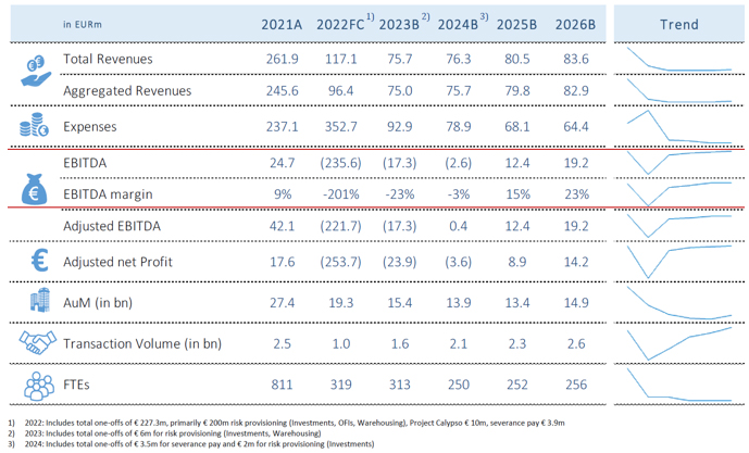 Ausblick und Business Plan der Corestate Gruppe Vor dem Hintergrund der geschilderten makroökonomischen Entwicklungen, geopolitischen Unsicherheiten und der Herausforderungen innerhalb der Corestate hat der Vorstand im September 2022 einen ambitionierten Business Plan verabschiedet. Dieser veranschaulicht unter anderem, dass Corestate trotz ambitionierter Restrukturierung und bei Eintritt der enthaltenen Prämissen erst im Jahr 2025 wieder positives EBITDA generieren wird.
