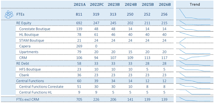Bereits eingeleitete operative Restrukturierungsmaßnahmen Trotz dieser Herausforderungen setzt der Vorstand seine strategische Agenda konsequent fort. Dazu gehört, dass interne Strukturen und Prozesse konsequent überprüft werden mit dem Ziel, die Komplexität in den Geschäftsbereichen wie auch in der Gesamtorganisation deutlich zu reduzieren. Diese Maßnahmen sind Teil des Anfang des Jahres initiierten Effizienzprogramms (move to the future), das inzwischen deutlich ausgeweitet wurde. Corestate arbeitet derzeit auf allen Ebenen daran, das Unternehmen flexibel und effizient zu machen und es für einen erfolgreichen Neustart zu positionieren. Mit Hochdruck wird dabei die Umsetzung von Kostensenkungsmaßnahmen betrieben. Dazu sind bereits operative Bereiche gebündelt, Doppelfunktionen und Overheads konsequent abgebaut worden; ferner sollen Standorte geschlossen werden. Auch stehen alle Sachkosten und sonstigen Aufwendungen auf dem Prüfstand. Auf der Kostenseite werden die Einsparungen bereits im vierten Quartal 2022 spürbar sein und sich dann im kommenden Jahr deutlich auswirken. Der Business Plan vom September 2022 sieht vor, dass die Kosten weiter bis zum Jahr 2026 sinken. Dies bringt insbesondere massiven Personalabbau innerhalb der Corestate Boutique mit sich: Bis 2026 soll der Personalbestand auf etwa 10 % reduziert werden (14 FTE in 2026 gegenüber noch 139 FTE in 2021). Auch die substantielle Wertberichtigung der HFS wird sich in der Personalplanung wiederfinden (von 23 auf 5 FTE). Über die gesamte Corestate Gruppe sollen im Jahr 2026 nur noch 256 von 811 FTE (Stand: 2021) beschäftigt sein. Ziel ist es, bis Mitte 2023 eine Strukturanpassung der Gruppe zu erreichen, hin zu einem effizienten und effektiven Investmenthaus mit dem Fokus auf die bekannten Bereiche Real Estate Equity und Real Estate Debt. Dieser Umbau soll auch die verschiedenen Kapitalverwaltungsgesellschaften einbeziehen. Neben der Revitalisierung und Weiterentwicklung des Investmentgeschäfts ist es daher im aktuell schwierigen Marktumfeld eine große Herausforderung, die Finanzverbindlichkeiten der Gruppe, insbesondere die Schuldverschreibungen, zu restrukturieren und Liquidität freizusetzen. Dies ist jedoch eine essentielle Voraussetzung für die zukünftige Handlungs- und auch Überlebensfähigkeit der Corestate. ![]()