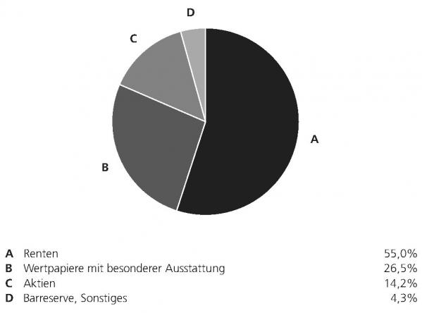 Der Fonds legt sein Vermögen schwerpunktmäßig in den Anlageklassen Renten und Aktien an. Zum Berichtsstichtag lag der Anlageschwerpunkt mit 81,5 Prozent auf Anleihen sowie internationalen Aktientiteln (14,2 Prozent).