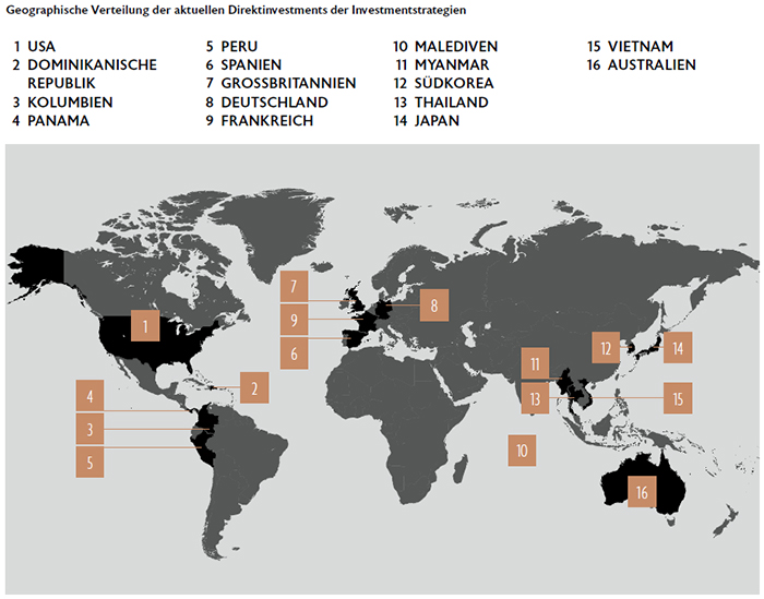 Die regionale Allokation verteilt sich zum Berichtsstichtag auf die Regionen Europa, Nord- und Lateinamerika sowie Asien-/Pazifik. Die Anzahl der Direktinvestments der gezeichneten institutionellen Investmentstrategien liegt zum 31.12.2019 bei insgesamt 133. Eine weitere Diversifikation wird durch die Streuung auf unterschiedliche Sektoren /Nutzungsarten, Nutzer und Währungen sichergestellt.