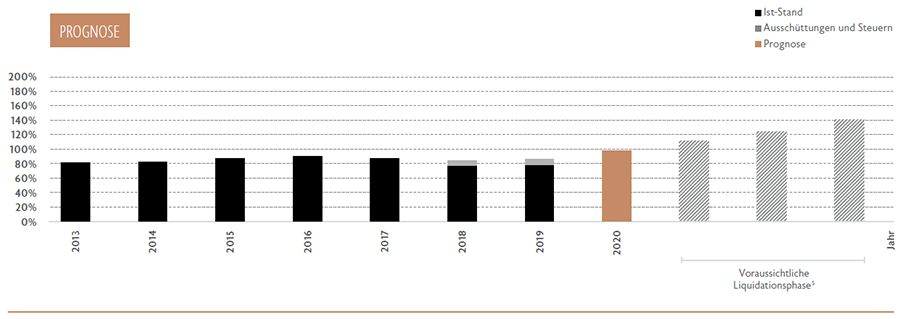 Der Nettoinventarwert (NIW) pro Anteil beträgt 0,77 EUR. bei 23.085.306 Anteilen. Unter Berücksichtigung der bereits erfolgten Ausschüttungen i. H. v. 8 % an die Anleger sowie gebuchter Steuern i. H. v. 1 % beträgt die Leistungsentwicklung am Geschäftsjahresende 0,86 EUR pro Anteil und ist gegenüber dem Vorjahreswert von 0,84 EUR um rund 2,4 % angestiegen.