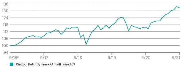 Der Fonds Weltportfolio Dynamik strebt die Erwirtschaftung eines nachhaltigen Wertzuwachses an. Um dies zu erreichen, legt er variabel weltweit in Aktien, verzinsliche Wertpapiere, die von Staaten und Unternehmen emittiert wurden, und Wertpapierfonds an, wobei mindestens 51% des Fondsvermögens in Aktien oder Aktienfonds investiert sein müssen.