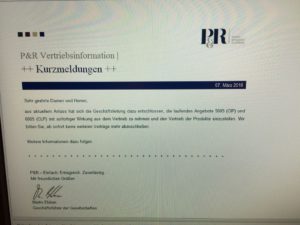 Diese Mitteilung des Unternehmens P & R schlägt dann sicherlich auch im Vertrieb ein wie eine Bombe. In einer kurzen knappen Mitteilung teilt das Unternehmen seinen Vertriebspartnern mit, dass man kein Neugeschäft mehr für 5005 CIP und 6005 CLP abschließen möge. Beide Produkte haben wir unten mit einem pdf Link aufgeführt.Da kommen natürlich jetzt die „dümmsten Gedanken“ bei Kunden und Vertriebspartner auf, was dann der Hintergrund für den Vertriebsstopp der beiden Angebote sein könnte.