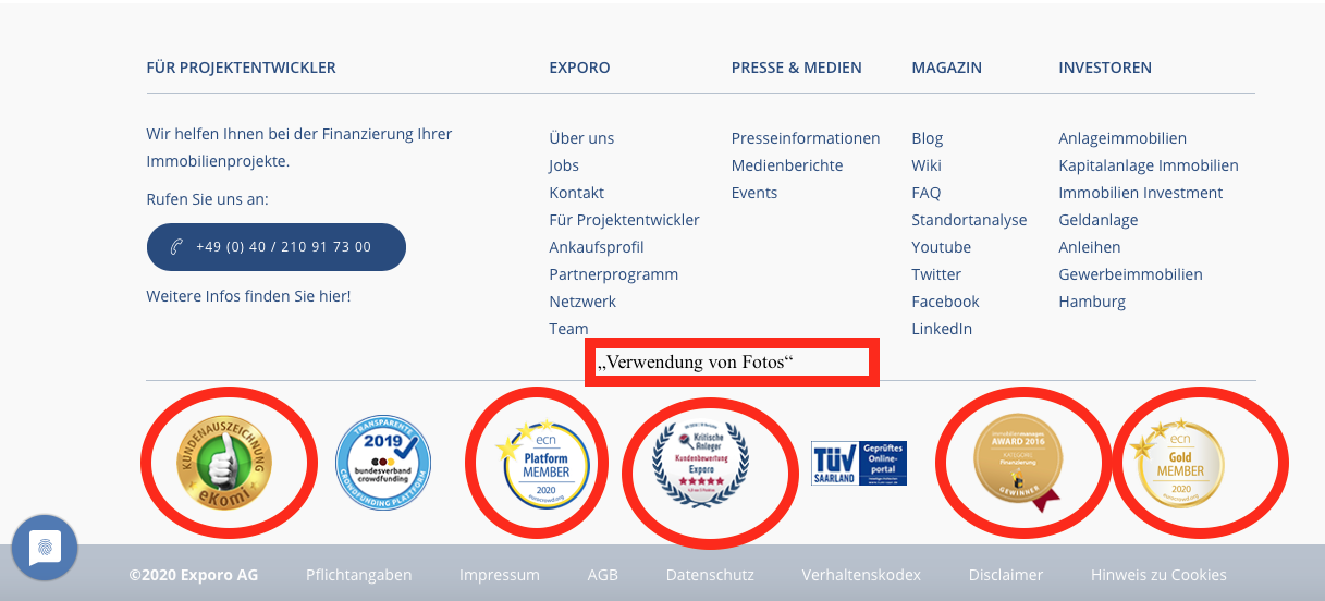 Exporo AG mach nach wie vor auf den Ihren Seiten in Österreich und Niederlande Werbung mit dem „goldenen- Siegel“ der eKombi Kundenbewertungsportal Werbung, Nutzung von nur einem Foto