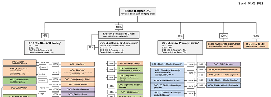 Die Ekosem-Gruppe ist in neun verschiedenen Regionen in Russland tätig. Der größte Betrieb befindet sich in der Region Woronesch ca. 500 km südlich von Moskau. Dort hat auch die russische Holding ihren Sitz. Der zweitgrößte Betrieb befindet sich in Sibirien mit Aktivitäten in Novosibirsk und Altai. Weitere landwirtschaftliche Großbetriebe befinden sich in der Wolgaregion, in Ryazan und Kaluga unweit von Moskau sowie in Kursk. Die Ekosem-Gruppe wird von einem Managementteam geleitet mit Stefan Dürr als Vorstandsvorsitzendem der deutschen Muttergesellschaft und Generaldirektor der russischen Zwischenholding-Gesellschaften. Die Betriebe vor Ort werden über eine Matrixstruktur gesteuert, in der die Leitungsfunktionen auf zwei voneinander unabhängige, gleichberechtigte Dimensionen verteilt sind. Zu den fachlichen Spezialisten in der Holding für die einzelnen Produktions- und Verwaltungsbereiche kommen regional verantwortliche Betriebsleiter. Einen Überblick über die Konzernstruktur zum 1. März 2022 bietet das nachfolgende Schaubild: ![]() ![]()
