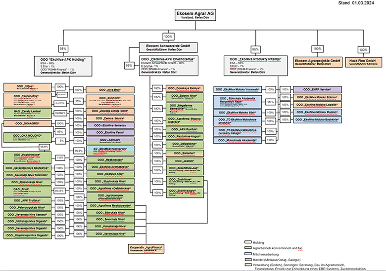 Die Ekosem-Gruppe ist in 13 verschiedenen Regionen in Russland tätig. Der größte Betrieb befindet sich in der Region Woronesch ca. 500 km südlich von Moskau. Dort haben auch die russischen Zwischenholdings ihren Sitz. Der zweitgrößte Betrieb befindet sich in Sibirien mit Aktivitäten in Novosibirsk und Altai. Weitere landwirtschaftliche Großbetriebe befinden sich in der Wolgaregion, in Ryazan und Kaluga unweit von Moskau sowie in Kursk. Die Ekosem-Gruppe wird von einem Managementteam geleitet mit Stefan Dürr als einzigem Vorstandsmitglied der deutschen Muttergesellschaft und Generaldirektor der russischen Zwischenholding-Gesellschaften. Die Betriebe vor Ort werden über eine Matrixstruktur gesteuert, in der die Leitungsfunktionen auf zwei voneinander unabhängige, gleichberechtigte Dimensionen verteilt sind. Zu den fachlichen Spezialisten in der Holding für die einzelnen Produktions- und Verwaltungsbereiche kommen regional verantwortliche Betriebsleiter hinzu. Einen Überblick über die aktuelle Konzernstruktur zum 1. März 2024 bietet das nachfolgende Schaubild: |