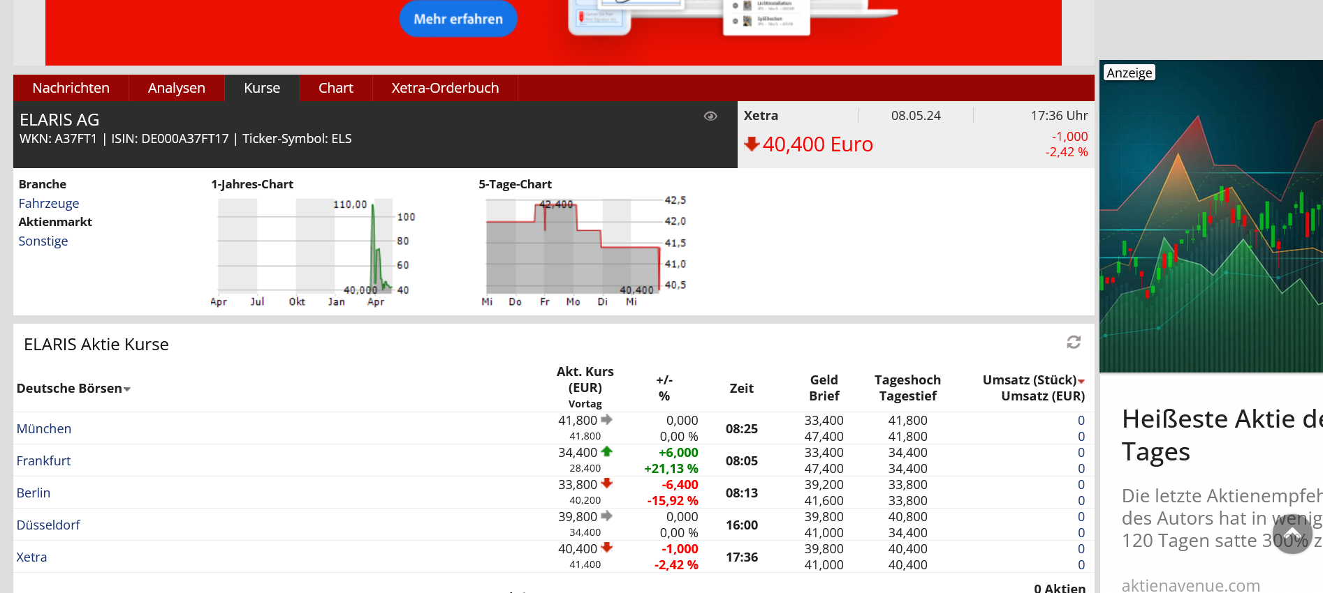 Heute werfen wir einen Blick auf die Aktie der Elaris AG, einem Unternehmen aus Grünstadt in Rheinland-Pfalz, das sich als Autoimporteur einen Namen machen möchte. Jedoch könnte der Zeitpunkt für den Markteintritt ungünstig gewählt sein. Die Zulassungszahlen für Elektroautos in Deutschland sind seit der Abschaffung der Kaufprämie stark rückläufig. Zusätzlich erschwert die unzureichende Anzahl an Ladestationen die Situation für Elektrofahrzeuge weiter. Ein weiterer Punkt ist die Kostenfrage: Das Aufladen eines Elektroautos kann teurer ausfallen als das Tanken eines herkömmlichen Verbrennungsmotors. Diese Faktoren könnten die Nachfrage nach Elektroautos und somit auch die Geschäftsaussichten der Elaris AG negativ beeinflussen.