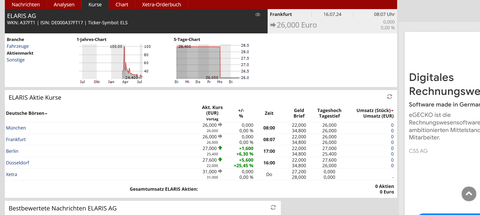 Stimmen solche Kommentare, dann, Herr Stevenson, fragen wir uns natürlich, wie man dann überhaupt das bereits kräftig nach unten korrigierte Umsatzziel erreichen kann? Manchmal haben wir den Eindruck, dass es im Hause ELARIS AG nicht unbedingt gutes Fachpersonal gibt, so langsam wie das vorangeht.