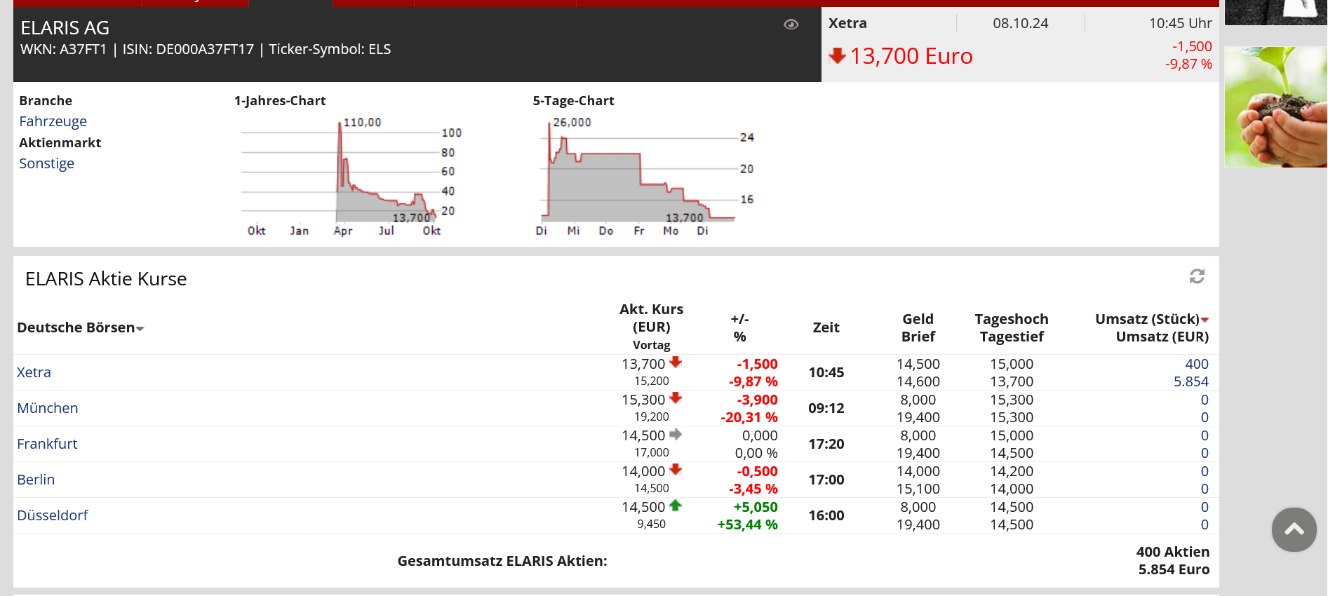 So könnte man den heutigen Tag für das Unternehmen Elaris AG aus Grünstadt treffend zusammenfassen. Auffällig ist jedoch, dass es zunehmend Tage gibt, an denen eine größere Anzahl von Aktien den Besitzer wechseln, was jedoch – wie auch heute – oft mit einem Kursrutsch einhergeht. Das bedeutet, die Käufer waren offenbar nicht bereit, höhere Preise für die Aktie zu zahlen. Dies erscheint verständlich, denn es gibt derzeit keine nennenswerten Meldungen oder positiven Nachrichten, die den Aktienkurs nachhaltig nach oben treiben könnten.