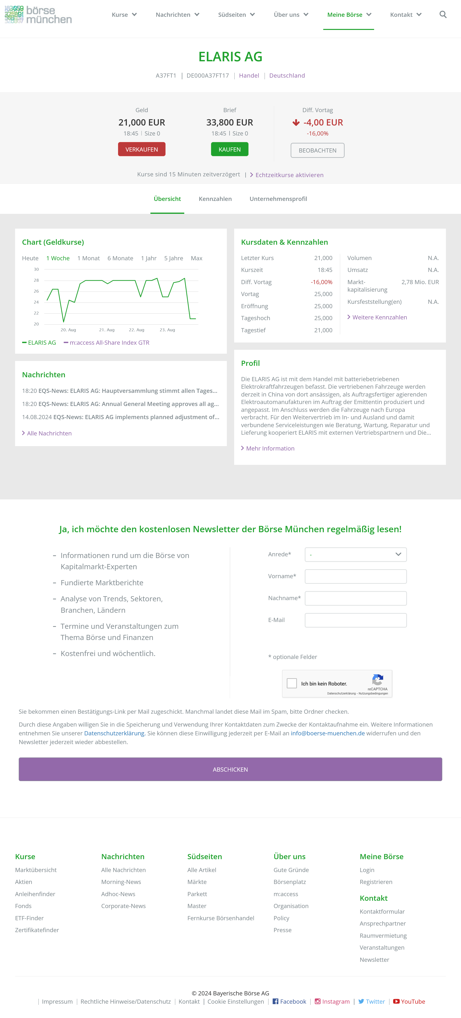 Die Aktionäre der ELARIS AG (“ELARIS”, ISIN DE000A37FT17) haben auf der heutigen ordentlichen Hauptversammlung allen Tagessordnungspunkten mit großer Mehrheit von mehr als 97,6 % zugestimmt. Insgesamt waren 93,9 % des Grundkapitals auf der Hauptversammlung vertreten. Der ELARIS-Vorstand stellte auf der Hauptversammlung u.a. die Wachstumsstrategie des Unternehmens vor. Demnach plant ELARIS seine Modellpalette weiter auszubauen, neue strategische Partnerschaften einzugehen und sein internationales Wachstum weiter zu forcieren. Na dann hoffen wir mal, CEO Stevenson, das das nicht nur Worthülsen waren, sondern man dann auch den Erfolg sehen kann. Im Moment würde mir als Aktionäre noch „bange ums Herz“.