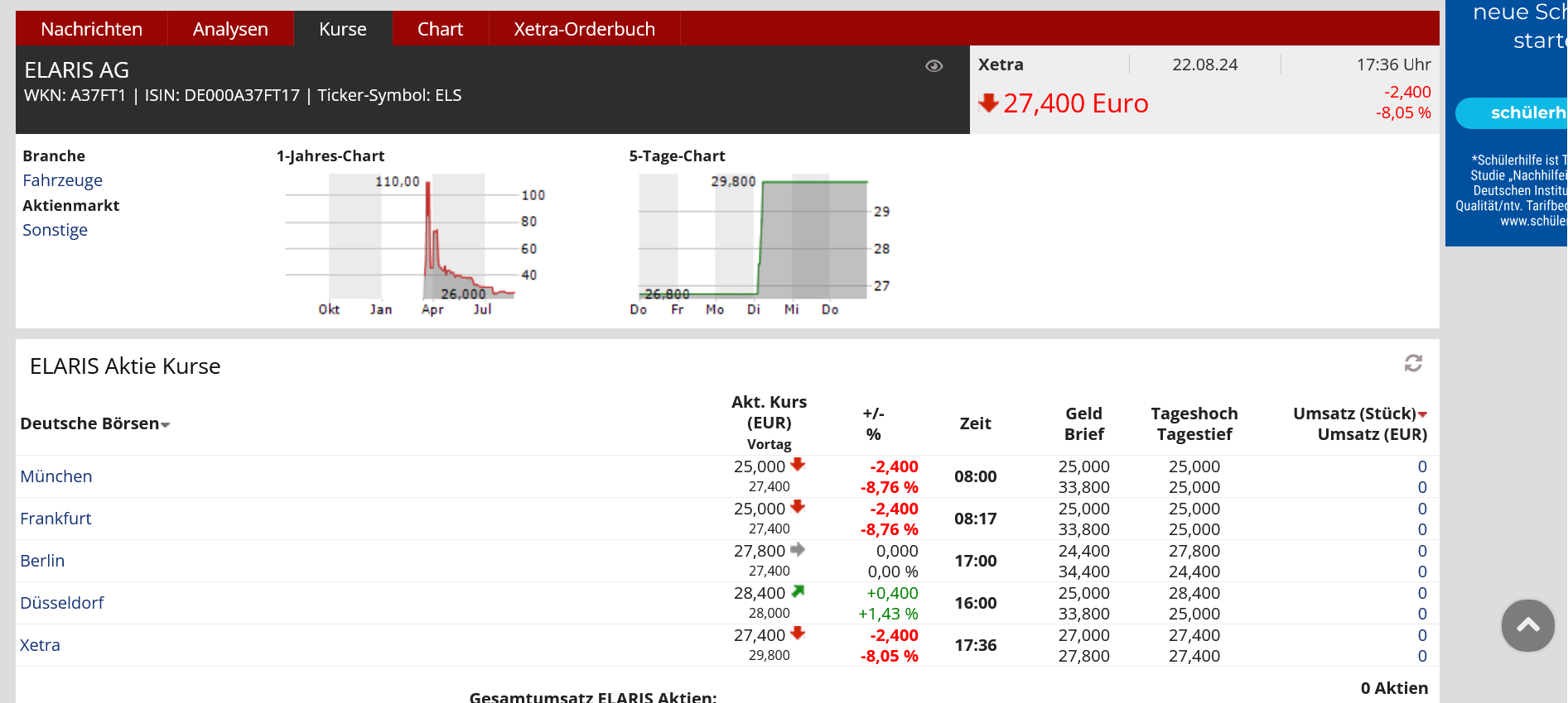 Eigentlich würde sich doch so kurz vor der Hauptversammlung ein Anstieg der Aktienumsätze an der Börse durchaus gut machen, aber auch heute gibt es leider wieder keine Aktiennachfrage, die wir vermelden könnten. Was werden Sie, sehr geehrter Herr Stevenson, den Aktionären auf die Frage antworten „Was tut Elaris AG, um stärker an der Börse nachgefragt zu werden“? Zudem wird man sicherlich auch nach dem aktuellen Umsatz bis zum 30. Juni 2024 bei den Elaris Fahrzeugen nachfragen. Mal sehen, wie da die Antwort von Lars Stevenson lautet.