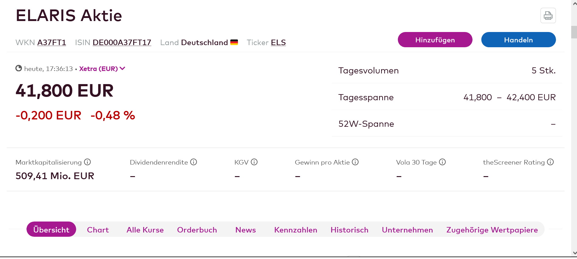 Ja, nachdem der letzte kleine Lichtblick von über 100 Aktien, die man an einem Tag gehandelt hatte, nun wieder der Einbruch auf 5 Aktien kam. Vielleicht hat dazu auch der Feiertag beigetragen, denn möglicherweise haben sich viele potenzielle Aktienkäufer der Elaris AG lieber ein verlängertes Wochenende geleistet, als eine Elaris-Aktie zu kaufen. Eine vernünftige Entscheidung aus unserer Sicht.