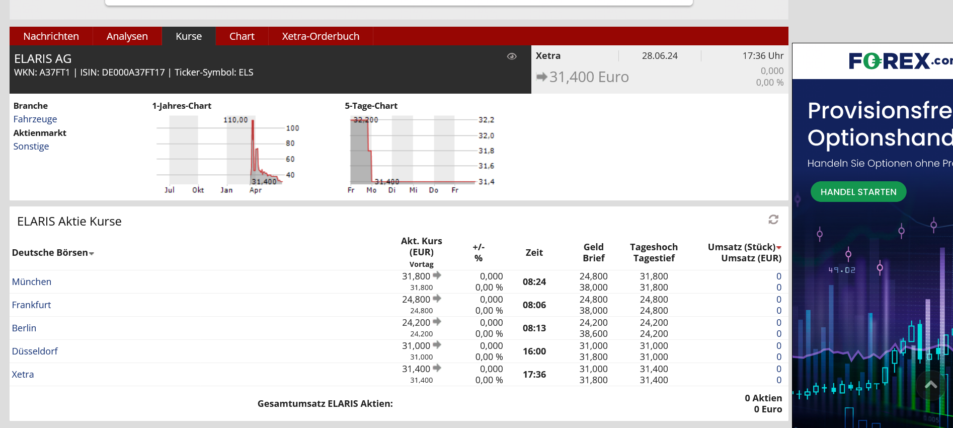 Am Ende der Woche muss man eigentlich eine verheerende Bilanz zum Handelsvolumen der ELARIS AG an den Börsen feststellen. Hier muss aus meiner Sicht mehr im Marketing getan werden, oder gibt es so wenig berichtenswerte gute Nachrichten zum Unternehmen ELARIS AG? Machen Sie doch den Zögernden einmal klar, was für ein tolles Händlernnetz sie haben, und wie gut der Verkauf der Elaris AG-Modelle funktioniert. Dann klappt das auch mit der Nachfrage nach Aktien.