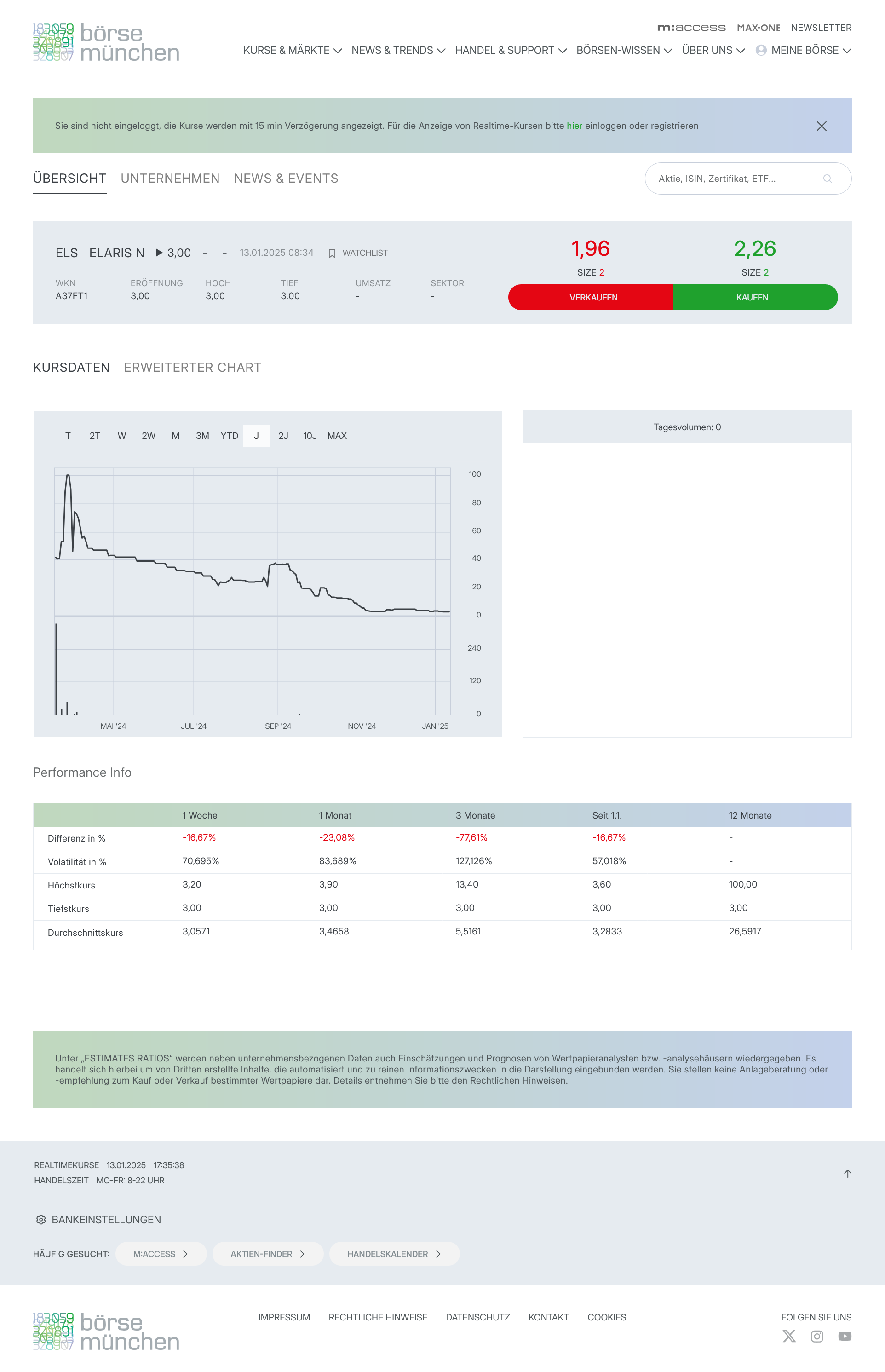 so sar´te es uns ein User unerer Plattform der auc in Elaris Aktien investiert ist. Für fast 10.000 Euro hat er nach eigenen Angaben investier, zu einem Kurs von über 30 Euro. Er sieht das aber wohl ganz entspannt, mal gewinnt man mal verliert man. Recht hat er, aber wir haben auch den einen oder anderen Gesprächspartner der durchaus verärgert ist über den Nichterfolg des Unternehmens Elaris AG. Wie heißt es so schön, wer eine Aktie kauft,kauft nicht das Recht damit einen Gewinn zu machen.