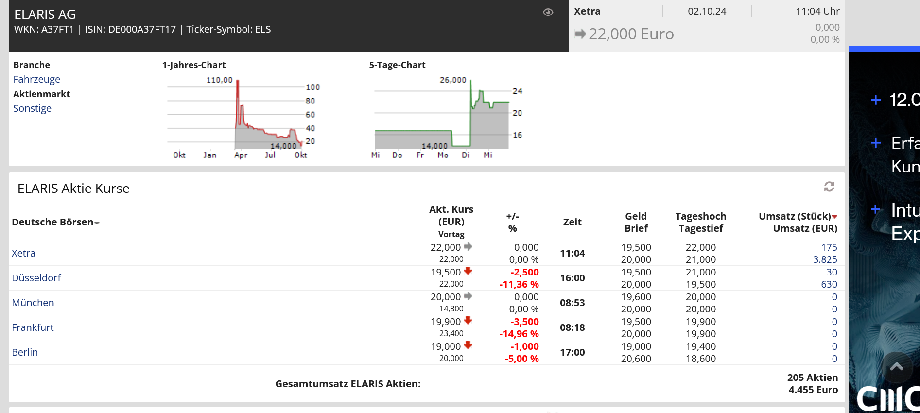 Auch heute wieder ein guter Tag für Elaris, was den Aktienverkauf anbetrifft, und natürlich fragt man sich auch, wer hier Kasse macht oder möglicherweise seine Verluste begrenzt. Beides wäre ja theoretisch und praktisch möglich. Nun haben wir ja morgen einen börsenfreien Tag, an dem es sicherlich keine frischen Zahlen geben wird. Trotzdem, Herr Lars Stevenson, mich würde interessieren, wer die Käufer der Aktien sind und was sie für ihre Aktien bezahlt haben.