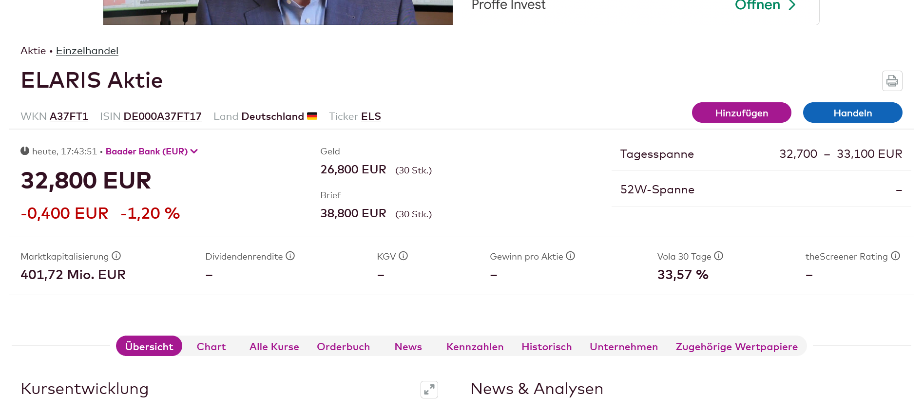 Die Untersuchungen der BaFin gegen ELARIS werden auch dazu beitragen, dass die Aktie nicht gefragt wird. Nur eine Frage der Zeit, bis das Unternehmen komplett Pleite geht.