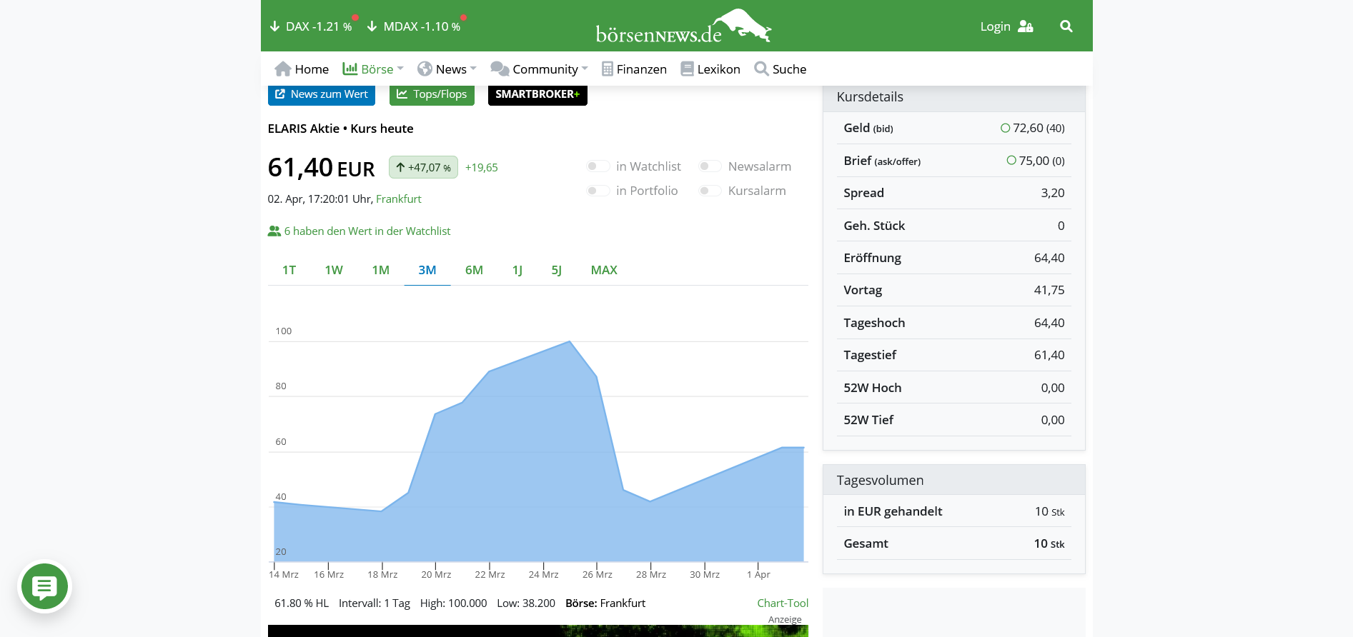 Heute wurden, siehe Screenshot, insgesamt 10 Aktien gehandelt. Natürlich haben wir eine Osterwoche, in der erfahrungsgemäß viele Menschen im Urlaub sind. Ob das hier auch Auswirkungen auf das Unternehmen ELARIS AG hat, wäre reine Spekulation. Keine Spekulation hingegen ist der Aktienkurs und die gehandelte Stückzahl. Gedanken machen wir uns nur über dioe erheblichen, für uns nicht nachvollziehbaren, Kurssprünge der Aktie.