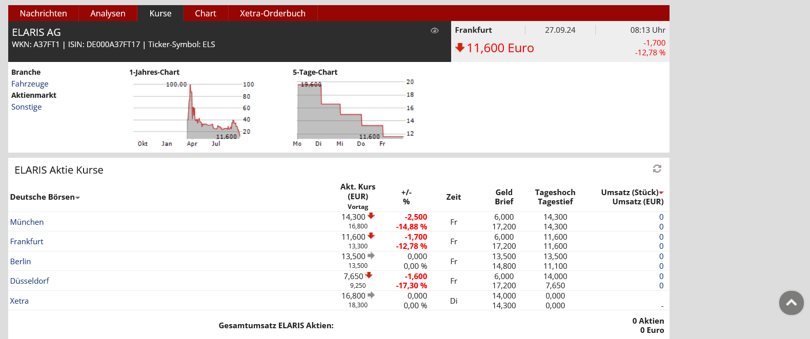 Gemeint ist der Verkauf bzw. die Nachfrage nach der Elaris-Aktie. Wie man dem nachstehenden Screenshot entnehmen kann, gab es am gestrigen Tag nicht eine einzige verkaufte Aktie, trotz positiver Nachrichten, dass die Kiesel Group beim Unternehmen eingestiegen ist.