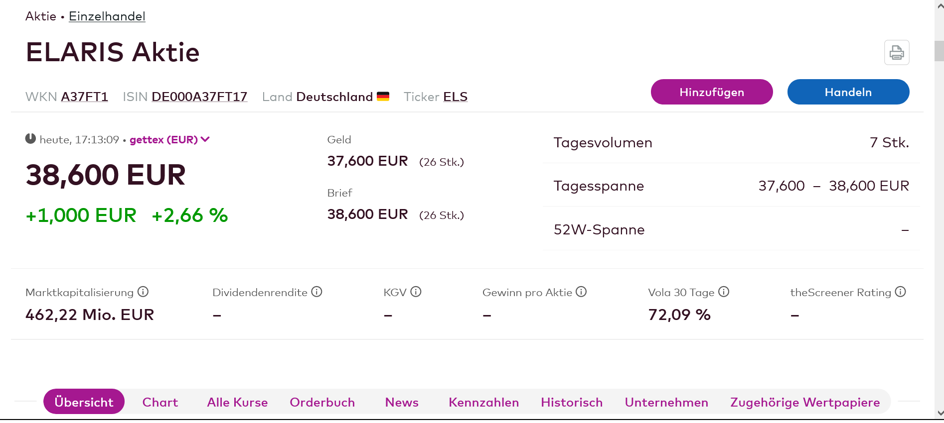 Zum Jubeln im Hause von Lars Stevenson sicherlich zu wenig, aber immerhin, auch das wollen wir hier feststellen: 7 Aktien mehr als gestern. Wann erlebt man schon mal eine solche Steigerung? Es gibt so viele Jubelmeldungen aus dem Hause Alaris AG. Warum führen diese eigentlich nicht zu einem besseren Aktienumsatz? Warum, sehr geehrter Herr Stevenson, veröffentlichen Sie nicht einmal alle Zulassungen, die es bei Alaris AG bis heute gab, und möglicherweise an einem Zeitstrahl, wie sich die Zulassungszahlen entwickelt haben? Das könnte, wenn die Zahlen dann überzeugend sind, den einen oder anderen Anleger sicherlich dazu bewegen, Alaris-Aktien zu ordern.