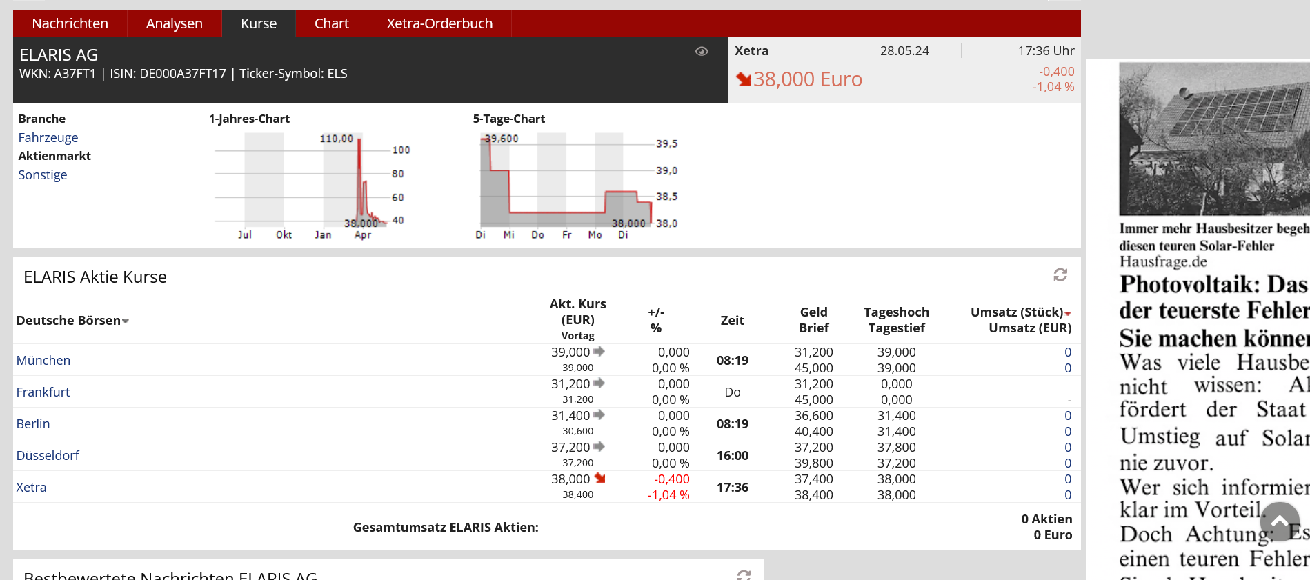 Auch das kann man an dem unten beigefügten Screenshot ablesen. Wieder ein gebrauchter Tag für das Unternehmen ELARIS AG aus Grünstadt in Rheinland-Pfalz. Scheinbar gibt es nach wie vor wohl wenige interessierte Shareholder, die Interesse am Erwerb von Aktien des Unternehmens haben. Nachvollziehbar aus unserer Sicht, wenn man sich einmal genauer anschaut, welche Rolle das Unternehmen ELARIS AG in der E-Autobranche spielt, und mir fehlt jegliche Fantasie, wie sich das verändern könnte. Vielleicht fällt Herrn Stevenson dazu etwas ein.