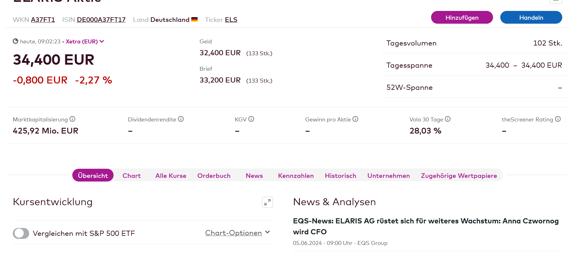Auch heute schauen wir uns natürlich wieder das Unternehmen ELARIS AG an der Börse an, so wie jeden Tag. Wir wollen sehen, ob sich was verändert zum Positiven hin. Zumindest hat man heute einmal Aktien im 3-stelligen Bereich an den Aktionär gebracht, wenn auch soeben die Grenze im kleinsten 3-stelligen Bereich überschritten wurde..